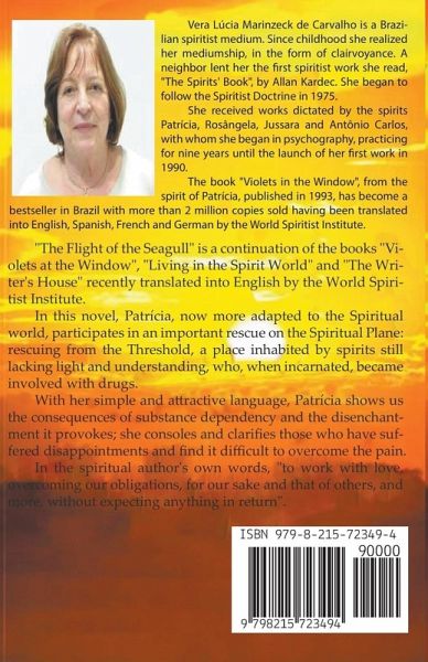 "The Flight of the Seagull" is a continuation of the books "Violets at the Window", "Living in the Spirit World" and "The Writer's House" recently translated into English by the World Spiritist Institute. In this novel, Patrícia, now more adapted to the Spiritual world, participates in an important rescue on the Spiritual Plane: rescuing from the Threshold, a place inhabited by spirits still lacking light and understanding, who, when incarnated, became involved with drugs. With her simple and attractive language, Patrícia shows us the consequences of substance dependency and the disenchantment it provokes; she consoles and clarifies those who have suffered disappointments and find it difficult to overcome the pain. In the spiritual author's own words, "to work with love, overcoming our obligations, for our sake and that of others, and more, without expecting anything in return".
