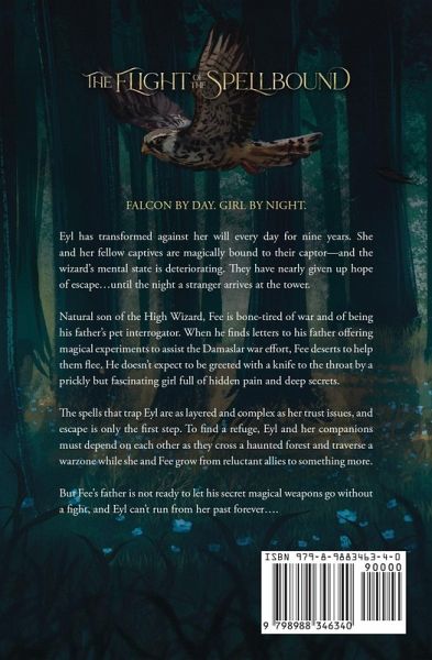 Falcon by day. Girl by night. Eyl has transformed against her will every day for nine years. She and her fellow captives are magically bound to their captor-and the wizard's mental state is deteriorating. They have nearly given up hope of escape...until the night a stranger arrives at the tower. Natural son of the High Wizard, Fee is bone-tired of war and of being his father's pet interrogator. When he finds letters to his father offering magical experiments to assist the Damaslar war effort, Fee deserts to help them flee. He doesn't expect to be greeted with a knife to the throat by a prickly but fascinating girl full of hidden pain and deep secrets. The spells that trap Eyl are as layered and complex as her trust issues, and escape is only the first step. To find a refuge, Eyl and her companions must depend on each other as they cross a haunted forest and traverse a warzone while she and Fee grow from reluctant allies to something more. But Fee's father is not ready to let his secret magical weapons go without a fight, and Eyl can't run from her past forever.... THE FLIGHT OF THE SPELLBOUND is a romantic fantasy adventure perfect for fans of Ladyhawke, Willow the Series, and Shannon Hale. It is the second in the Karneesia Chronicles, interconnected standalones set in the world of Karneesia.