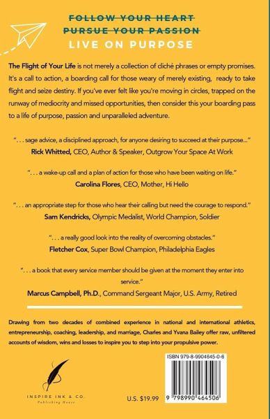 Dive into the inspiring narrative of 'The Flight of Your Life' by Charles and Yvana Bailey-a dynamic duo of former Olympic hopefuls turned coaches and entrepreneurs. This isn't just another self-help book; it's a gripping tale of triumph, transformation, and the relentless pursuit of greatness. Drawing from their own remarkable journey and enriched by their expertise in human performance sciences, business strategy, and education, the Baileys offer a roadmap to real success that's as practical as it is profound. Through relatable anecdotes, actionable strategies, and insightful reflections, they invite you to embark on a journey of self-discovery and empowerment. Whether you're an athlete striving for peak performance, a leader navigating the complexities of leadership of self and others, or an aspiring achiever with dreams yet to be fully realized, 'The Flight of Your Life' is your guide to unleashing your full potential and that of others. It's a deeply profound narrative of resilience, resourcefulness, and the unwavering belief that with the right mindset, strategies, relationships, and faith, anything is possible. Join Charles and Yvana as they share their hard-earned wisdom and hard-won victories, inspiring you to overcome obstacles, challenge limitations, and soar to new heights. Don't just dream of success-seize it with both hands. The sky is not your limit. Get this copy of 'The Flight of Your Life' today and take the first step towards living your greatest ambitions and higher callings.