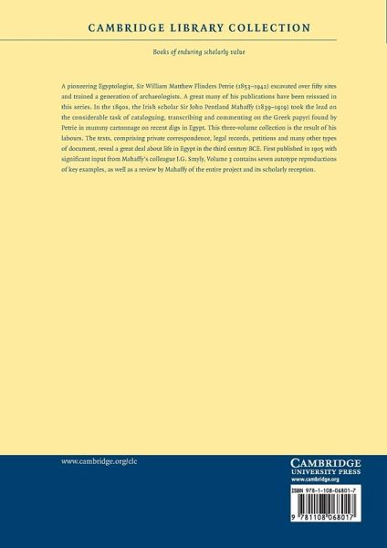 A pioneering Egyptologist, Sir William Matthew Flinders Petrie (1853-1942) excavated over fifty sites and trained a generation of archaeologists. A great many of his publications have been reissued in this series. In the 1890s, the Irish scholar Sir John Pentland Mahaffy (1839-1919) took the lead on the considerable task of cataloguing, transcribing and commenting on the Greek papyri found by Petrie in mummy cartonnage on recent digs in Egypt. This three-volume collection is the result of his labours. The texts, comprising private correspondence, legal records, petitions and many other types of document, reveal a great deal about life in Egypt in the third century BCE. First published in 1905 with significant input from Mahaffy's colleague J. G. Smyly, Volume 3 contains seven autotype reproductions of key examples, as well as a review by Mahaffy of the entire project and its scholarly reception.