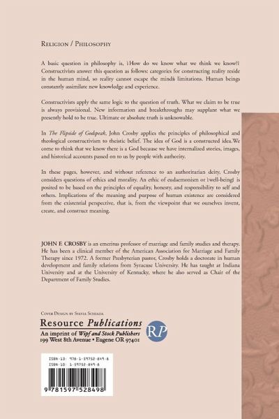 A basic question in philosophy is, ""how do we know what we think we know? Constructivists answer this question as follows: categories for constructing reality reside in the human mind, so reality cannot escape the mind's limitations. Human beings constantly assimilate new knowledge and experience. Constructivists apply the same logic to the question of truth. What we claim to be true is always provisional. New information and breakthroughs may supplant what we presently hold to be true. Ultimate or absolute truth is unknowable. In The Flipside of Godspeak, John Crosby applies the principles of philosophical and theological constructivism to theistic belief. The idea of God is a constructed idea.We come to think that we know there is a God because we have internalized stories, images, and historical accounts passed on to us by people with authority. In these pages, however, and without reference to an authoritarian deity, Crosby considers questions of ethics and morality. An ethic of eudaemonism or ""well-being is posited to be based on the principles of equality, honesty, and responsibility to self and others. Implications of the meaning and purpose of human existence are considered from the existential perspective, that is, from the viewpoint that we oursleves invent, create, and construct meaning.
