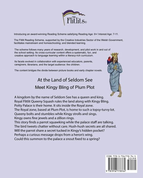 Introducing the Flitlits to Young Readers At your place, or any space where flowers grow or rivers flow, spring up! Spot folk at plots that time forgot within a shaded shelter. A map at hand lays out the land. It is a hidden corner. Funny fables come your way that share the far folk's daring days. They may be tricky, good, or better. The folk flit and swish. They float when they wish. Follow them soon. THE FLITLITS About Introductory Book 1 / KINGY BLING / Confident Reading / US English Version A kingdom by the name of Seldom See has a queen and king. Royal Flitlit Queeny Squash rules the land along with Kingy Bling. Potty Palace is their home. It sits inside the Royal zone. The Royal zone, based at Plum Plot, is home to such a topsy-turvy lot. Queeny bolts and stumbles while Kingy strolls and sings. Kingy owns fine jewels and a zillion rings. Find a parrot squawking while the palace staff are talking. The bird tweets chatter without care. Hush-hush secrets are all shared. Will the parrot share a secret tucked in Kingy's hidden pocket? Perhaps a curious message drops from a heron's wing. Could this summon to the palace a snout fixed to a spring?
