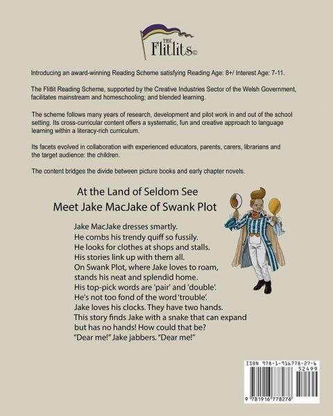 Introducing the Flitlits to Young Readers At your place, or any space where flowers grow or rivers flow, spring up! Spot folk at plots that time forgot within a shaded shelter. A map at hand lays out the land. It is a hidden corner. Funny fables come your way that share the far folk's daring days. They may be tricky, good or better. The folk flit and swish. They float when they wish. Follow them soon. THE FLITLITS ¿¿¿About Introductory Book 10 / JAKE MacJAKE / Supported Reading / UK English Version Jake MacJake dresses smartly. He combs his trendy quiff so fussily. He looks for clothes at shops and stalls. His stories hook up with them all. Jake MacJake owns many capes and he feels snug among their drapes. On Swank Plot, where Jake loves to roam, stands his neat and splendid home. He shares his home with his smart mother, playful dogs and Jake, his father. His top-pick words are pair and double. He's not too fond of the word trouble. Jake loves his clocks. They have two hands. STORY 10 finds Jake learning that snakes are able to expand, but have no hands! How could that be? "Dear me!" Jake jabbers. "Dear me!"