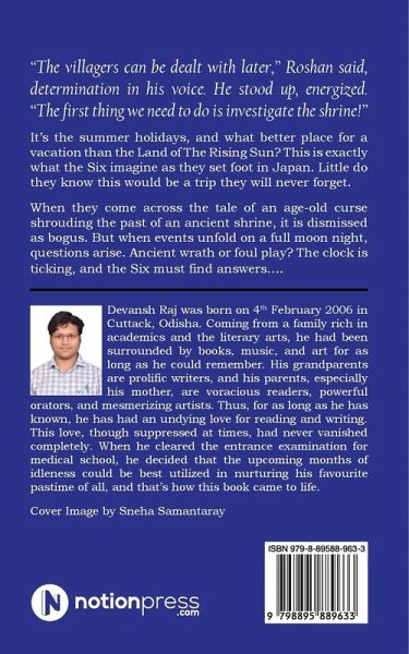 "The villagers can be dealt with later," Roshan said, determination in his voice. He stood up, energized. "The first thing we need to do is investigate the shrine!" It's the summer holidays, and what better place for a vacation than the Land of The Rising Sun? This is exactly what the Six imagine as they set foot in Japan. Little do they know this would be a trip they will never forget. When they come across the tale of an age-old curse shrouding the past of an ancient shrine, it is dismissed as bogus. But when events unfold on a full moon night, questions arise. Ancient wrath or foul play? The clock is ticking, and the Six must find answers....