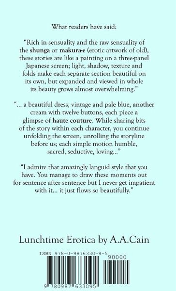 Adam Cain is in his fifties, a lover of art and beautiful things; but his soul is jaded, a little damaged, a little decadent. He finds simple pleasure in the daily ritual of cafes and coffee in the mornings, and slowly makes simple friendships with the young women who work behind the counters. Over time, the grace and beauty of these women breaks down his reserve, and seduction begins. But who is seducing whom? The writing has been described as, "silkily erotic... slow and sensuous descriptions of an elegant world beyond time and place... layer on layer of lovely, well written imagery... a place to escape..." This novella, Gabriela - Twelve Silken Buttons, is part of A.A.Cain's Lunchtime Erotica series, a collection of convenient pocket sized books ideal for those quiet lunchtimes or coffee breaks. An e-book edition of this novella is available in The Floating World - Urban Erotica.