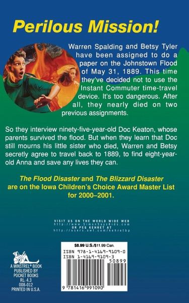 Warren Spalding and Betsy Tyler have been assigned to do a paper on the Johnstown Flood of May 31, 1889. This time they've decided no to use the Instant Commuter time-travel device. It's too dangerous. After all, they nearly died on two previous assignments. So they interview ninety-five-year-old Doc Keaton, whose parents survived the flood. But when they learn that Doc still mourns his little sister who died, Warren and Betsy secretly agree to travel back to 1889, to find eight-year-old Anna and save any lives they can.