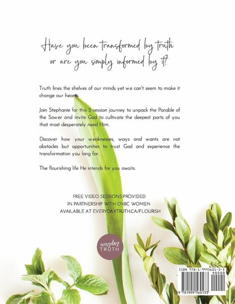 We long to be transformed by truth, but so often we only feel informed by it. Truth lines the shelves of our minds but on our own, we can't make it change our hearts. Much like the packed soil of a garden must be tilled after the weight of winter before it can be used, our hearts must be cultivated in order for seeds of truth to be planted, to take root and bear fruit. As we unpack the Parable of the Sower, we'll ask God to unearth and cultivate the path-like, rocky, and thorny parts of our hearts so that His Word can transform the deepest parts of us that most desperately need Him. Our lives were made to bear much fruit, showing ourselves to be Jesus' disciples, but not before roots. Get your copy today and discover the transforming power of trusting God with your weaknesses, ways and wants so you can spiritually flourish the way Jesus intended you to. The Flourishing Life includes: A 28-day personal study guide help you move past information to transformation 5 Video Viewer Guides to accompany video teaching sessions Free access to 5 Video Teaching Sessions thanks to a partnership with CNBC Women available at everydaytruth.ca/flourish Small group leader training for those wanting to invite others along for the journey