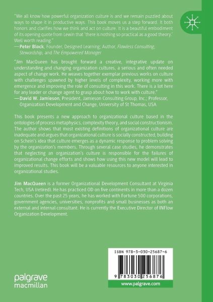This book presents a new approach to organizational culture based in the ontologies of process metaphysics, complexity theory, and social constructionism. The author shows that most existing definitions of organizational culture are inadequate and argues that organizational culture is socially constructed, building on Schein's idea that culture emerges as a dynamic response to problem solving by the organization's members. Through several case studies, he demonstrates that neglecting an organization's culture is responsible for the failures of organizational change efforts and shows how using this new model will lead to improved results. This book will be a valuable resources to anyone interested in organizational studies.