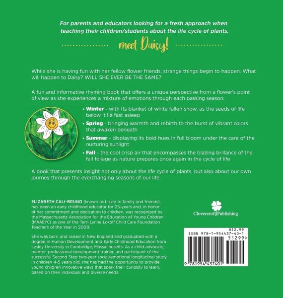 For parents and educators looking for a fresh approach when teaching their children/students about the life cycle of plants, meet Daisy! While she is having fun with her fellow flower friends, strange things begin to happen. What will happen to Daisy? WILL SHE EVER BE THE SAME? A fun and informative rhyming book that offers a unique perspective from a flower's point of view as she experiences a mixture of emotions through each passing season: * Winter - with Its blanket of white fallen snow, as the seeds of life below it lie fast asleep, * Spring - bringing warmth and rebirth to the burst of vibrant colors that awaken beneath, * Summer - displaying its bold hues in full bloom under the care of the nurturing sunlight, and * Fall - the cool crisp air that encompasses the blazing brilliance of the fall foliage as nature prepares once again in the cycle of life. A book that presents insight not only about the life cycle of plants, but also about our own journey through the everchanging seasons of our life.