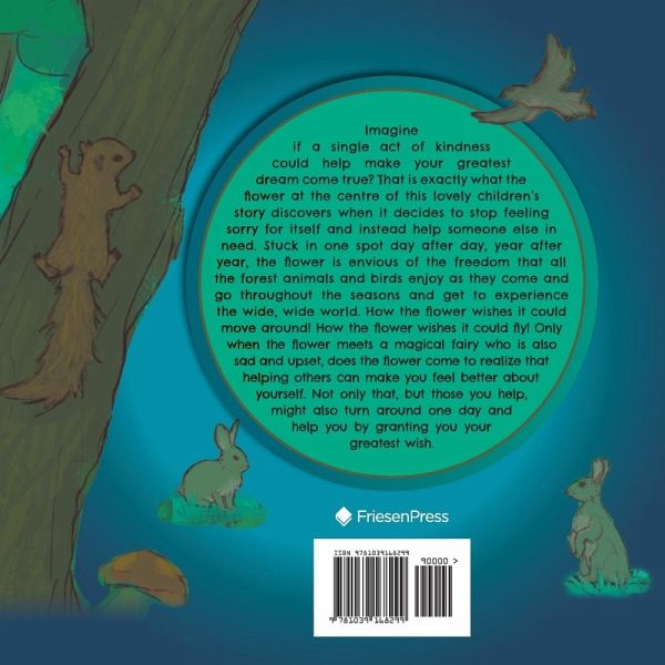 Imagine if a single act of kindness could help make your greatest dream come true? That is exactly what the flower at the centre of this lovely children's story discovers when it decides to stop feeling sorry for itself and instead help someone else in need. Stuck in one spot day after day, year after year, the flower is envious of the freedom that all the forest animals and birds enjoy as they come and go throughout the seasons and get to experience the wide, wide world. How the flower wishes it could move around! How the flower wishes it could fly! Only when the flower meets a magical fairy who is also sad and upset, does the flower come to realize that helping others can make you feel better about yourself. Not only that, but those you help, might also turn around one day and help you by granting you your greatest wish.
