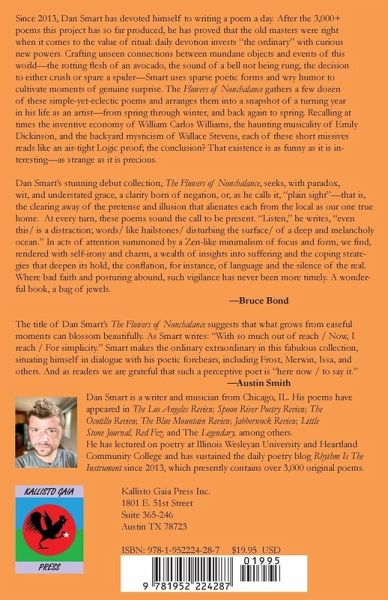 Since 2013, Dan Smart has devoted himself to writing a poem a day. After the 3,000+ poems this project has so far produced, he has proved that the old masters were right when it comes to the value of ritual: daily devotion invests "the ordinary" with curious new powers. Crafting unseen connections between mundane objects and events of this world-the rotting flesh of an avocado, the sound of a bell not being rung, the decision to either crush or spare a spider-Smart uses sparse poetic forms and wry humor to cultivate moments of genuine surprise. The Flowers of Nonchalance gathers a few dozen of these simple-yet-eclectic poems and arranges them into a snapshot of a turning year in his life as an artist-from spring through winter, and back again to spring. Recalling at times the inventive economy of William Carlos Williams, the haunting musicality of Emily Dickinson, and the backyard mysticism of Wallace Stevens, each of these short missives reads like an air-tight Logic proof; the conclusion? That existence is as funny as it is interesting-as strange as it is precious.