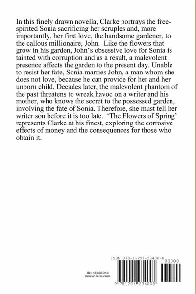 In this finely drawn novella, Clarke portrays the free-spirited Sonia sacrificing her scruples and, more importantly, her first love, the handsome gardener, to the callous millionaire, John. Like the flowers that grow his garden, John's obsessive love for Sonia is tainted with corruption and as a result, a malevolent presence affects the garden to the present day. Unable to resist her fate, Sonia marries John, a man whom she does not love, because he can provide for her and her unborn child. Decades later, the malevolent phantom of the past threatens to wreak havoc on a writer and his mother, who knows the secret to the possessed garden, involving the fate of Sonia. Therefore, she must tell her writer son before it is too late. 'The Flowers of Spring' represents Clarke at his finest, exploring the corrosive effects of money and the consequences for those who obtain it.