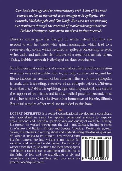 Can brain damage lead to extraordinary art? Some of the most renown artists in the world were thought to be epileptic. For example, Michelangelo and Van Gogh. But now we are proving our suspicions through the research of worldwide organizations. Debbie Motsinger is one artist involved in that research. Debbie's crisis gave her the gift of artistic talent. But first she needed to win her battle with spinal meningitis, which lead to a seventeen-day coma, which resulted in epilepsy. Relearning to read, write, walk, and talk, she also discovered a newfound artistic talent. Today, Debbie's artwork is displayed on three continents. Read this inspirational story of a woman whose faith and determination overcame very unfavorable odds to, not only survive, but expand her life to include her creation of beautiful art. The art of most epileptics is stark, and foreboding, evocative of an epileptic seizure. Different from that art, Debbie's is uplifting, light and inspirational. She credits the support of her friends and family, medical practitioners and, most of all, her faith in God. She lives in her hometown of Herrin, Illinois. Beautiful samples of her work are included in this book.
