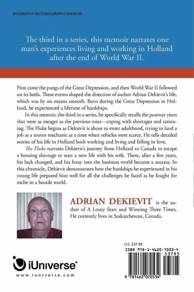 First came the pangs of the Great Depression, and then World War II followed on its heels. These events shaped the direction of author Adrian Dekievit's life, which was by no means smooth. Born during the Great Depression in Holland, he experienced a lifetime of hardships. In this memoir, the third in a series, he speci¿cally recalls the postwar years that were as meager as the previous ones-coping with shortages and rationing. The Fluke begins as Dekievit is about to enter adulthood, trying to land a job as a motor mechanic at a time when vehicles were scarce. He tells detailed stories of his life in Holland both working and living and falling in love. The Fluke narrates Dekievit's journey from Holland to Canada to escape a housing shortage to start a new life with his wife. There, after a few years, his luck changed, and his foray into the business world became a success. In this chronicle, Dekievit demonstrates how the hardships he experienced in his young life prepared him well for all the challenges he faced as he fought for niche in a hostile world.