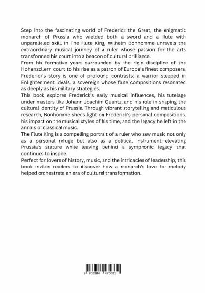 Step into the fascinating world of Frederick the Great, the enigmatic monarch of Prussia who wielded both a sword and a flute with unparalleled skill. In The Flute King, Wilhelm Bonhomme unravels the extraordinary musical journey of a ruler whose passion for the arts transformed his court into a beacon of cultural brilliance.From his formative years surrounded by the rigid discipline of the Hohenzollern court to his rise as a patron of Europe's finest composers, Frederick's story is one of profound contrasts: a warrior steeped in Enlightenment ideals, a sovereign whose flute compositions resonated as deeply as his military strategies.This book explores Frederick's early musical influences, his tutelage under masters like Johann Joachim Quantz, and his role in shaping the cultural identity of Prussia. Through vibrant storytelling and meticulous research, Bonhomme sheds light on Frederick's personal compositions, his impact on the musical styles of his time, and the legacy he left in the annals of classical music.The Flute King is a compelling portrait of a ruler who saw music not only as a personal refuge but also as a political instrument-elevating Prussia's stature while leaving behind a symphonic legacy that continues to inspire.Perfect for lovers of history, music, and the intricacies of leadership, this book invites readers to discover how a monarch's love for melody helped orchestrate an era of cultural transformation.