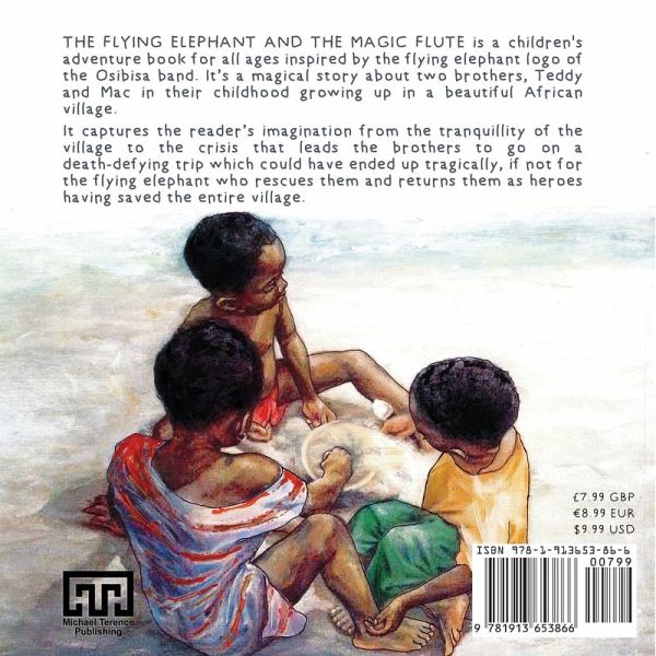 THE FLYING ELEPHANT AND THE MAGIC FLUTE is a children's adventure book for all ages inspired by the flying elephant logo of the Osibisa band. It's a magical story about two brothers, Teddy and Mac in their childhood growing up in a beautiful African village. It captures the reader's imagination from the tranquillity of the village to the crisis that leads the brothers to go on a death-defying trip which could have ended up tragically, if not for the flying elephant who rescues them and returns them as heroes having saved the entire village.