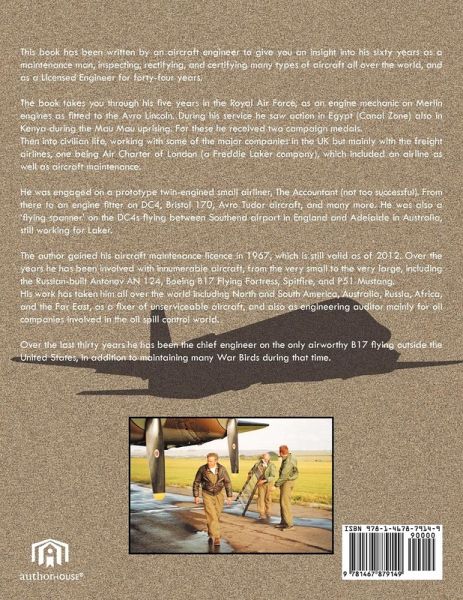 This book has been written by an aircraft engineer to give you an insight into his sixty years as a maintenance man, inspecting, rectifying, and certifying many types of aircraft all over the world, and as a Licensed Engineer for forty-four years. The book takes you through his five years in the Royal Air Force, as an engine mechanic on Merlin engines as fitted to the Avro Lincoln. During his service he saw action in Egypt (Canal Zone) also in Kenya during the Mau Mau uprising. For these he received two campaign medals. Then into civilian life, working with some of the major companies in the UK but mainly with the freight airlines, one being Air Charter of London (a Freddie Laker company), which included an airline as well as aircraft maintenance. He was engaged on a prototype twin-engined small airliner, The Accountant (not too successful). From there to an engine fitter on DC4, Bristol 170, Avro Tudor aircraft, and many more. He was also a 'flying spanner' on the DC4s flying between Southend airport in England and Adelaide in Australia, still working for Laker. The author gained his aircraft maintenance licence in 1967, which is still valid as of 2012. Over the years he has been involved with innumerable aircraft, from the very small to the very large, including the Russian-built Antonov AN 124, Boeing B17 Flying Fortress, Spitfire, and P51 Mustang. His work has taken him all over the world including North and South America, Australia, Russia, Africa, and the Far East, as a fixer of unserviceable aircraft, and also as engineering auditor mainly for oil companies involved in the oil spill control world. Over the last thirty years he has been the chief engineer on the only airworthy B17 flying outside the United States, in addition to maintaining many War Birds during that time.