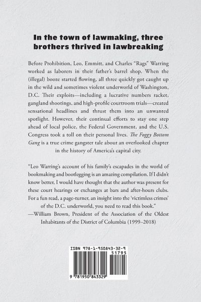 In the town of lawmaking, three brothers thrived in lawbreaking Before Prohibition, Leo, Emmitt, and Charles "Rags" Warring worked as laborers in their father's barrel shop. When the (illegal) booze started flowing, all three quickly got caught up in the wild and sometimes violent underworld of Washington, D.C. Their exploits-including a lucrative numbers racket, gangland shootings, and high-profile courtroom trials-created sensational headlines and thrust them into an unwanted spotlight. However, their continual efforts to stay one step ahead of local police, the Federal Government, and the U.S. Congress took a toll on their personal lives. The Foggy Bottom Gang is a true crime gangster tale about an overlooked chapter in the history of America's capital city. "Leo Warring's account of his family's escapades in the world of bookmaking and bootlegging is an amazing compilation. If I didn't know better, I would have thought that the author was present for these court hearings or exchanges at bars and after-hours clubs. For a fun read, a page-turner, an insight into the 'victimless crimes' of the D.C. underworld, you need to read this book." -William Brown, President of the Association of the Oldest Inhabitants of the District of Columbia (1999-2018)