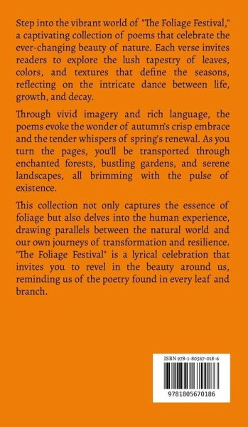 Step into the vibrant world of "The Foliage Festival," a captivating collection of poems that celebrate the ever-changing beauty of nature. Each verse invites readers to explore the lush tapestry of leaves, colors, and textures that define the seasons, reflecting on the intricate dance between life, growth, and decay. Through vivid imagery and rich language, the poems evoke the wonder of autumn's crisp embrace and the tender whispers of spring's renewal. As you turn the pages, you'll be transported through enchanted forests, bustling gardens, and serene landscapes, all brimming with the pulse of existence. This collection not only captures the essence of foliage but also delves into the human experience, drawing parallels between the natural world and our own journeys of transformation and resilience. "The Foliage Festival" is a lyrical celebration that invites you to revel in the beauty around us, reminding us of the poetry found in every leaf and branch.
