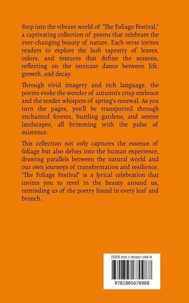 Step into the vibrant world of "The Foliage Festival," a captivating collection of poems that celebrate the ever-changing beauty of nature. Each verse invites readers to explore the lush tapestry of leaves, colors, and textures that define the seasons, reflecting on the intricate dance between life, growth, and decay. Through vivid imagery and rich language, the poems evoke the wonder of autumn's crisp embrace and the tender whispers of spring's renewal. As you turn the pages, you'll be transported through enchanted forests, bustling gardens, and serene landscapes, all brimming with the pulse of existence. This collection not only captures the essence of foliage but also delves into the human experience, drawing parallels between the natural world and our own journeys of transformation and resilience. "The Foliage Festival" is a lyrical celebration that invites you to revel in the beauty around us, reminding us of the poetry found in every leaf and branch.