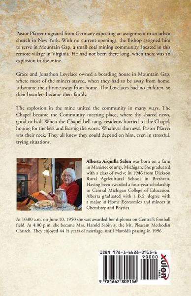 Pastor Pfarrer migrated from Germany expecting an assignment to an urban church in New York. With no current openings, the Bishop assigned him to serve in Mountain Gap, a small coal mining community, located in this remote village in Virginia. He had not been there long, when there was an explosion in the mine. Grace and Jonathon Lovelace owned a boarding house in Mountain Gap, where most of the miners stayed, when they had to be away from home. It became their home away from home. The Lovelaces had no children, so their boarders became their family. The explosion in the mine united the community in many ways. The Chapel became the Community meeting place, where thy shared news, good or bad. When the Chapel bell rang, residents hurried to the Chapel, hoping for the best and fearing the worst. Whatever the news, Pastor Pfarrer was their rock. They all knew they could depend on him, even in stressful, trying situations. Alberta Arquilla Sabin was born on a farm in Manistee county, Michigan. She graduated with a class of twelve in 1946 from Dickson Rural Agricultural School in Brethren. Having been awarded a four-year scholarship to Central Michigan College of Education, Alberta graduated with a B.S. degree with a major in Home Economics and minors in Chemistry and Physics. At 10:00 a.m. on June 10, 1950 she was awarded her diploma on Central's football field. At 4:00 p.m. she became Mrs. Harold Sabin at the Mt. Pleasant Methodist Church. They enjoyed 44 1/2 years of marriage, until Harold's passing in 1996.