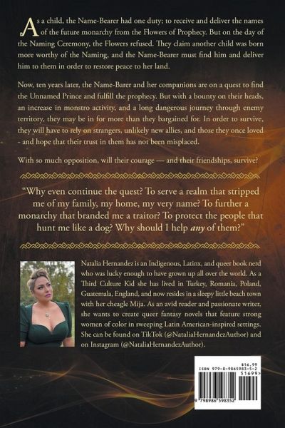 As a child, the Name-Bearer had one duty; to receive and deliver the names of the future monarchy from the Flowers of Prophecy. But on the day of the Naming Ceremony, the Flowers refused. They claim another child was born more worthy of the Naming, and the Name-Bearer must find him and bring him to them in order to restore peace to her land. Ten years later the Name-Bearer, along with trusted allies, sets out on her quest to find the Unnamed Prince and fulfill the prophecy. But embracing one's destiny is never an easy path, and they must battle enemy territory, a bounty on their heads, the increasing sightings of monstros, and more. With so much opposition, will their courage - and their friendships, survive?