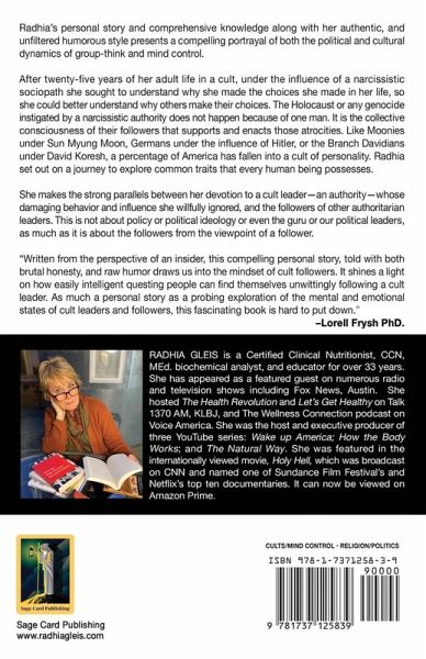 Winner of the 2021 PenCraft Book Award, 1st Place, Non Fiction - Autobiography Radhia's personal story and comprehensive knowledge along with her authentic, and unfiltered humorous style presents a compelling portrayal of both the political and cultural dynamics of group-think and mind control. After twenty-five years of her adult life in a cult, under the influence of a narcissistic sociopath she sought to understand why she made the choices she made in her life, so she could better understand why others make their choices. The Holocaust or any genocide instigated by a narcissistic authority does not happen because of one man. It is the collective consciousness of their followers that supports and enacts those atrocities. Like Moonies under Sun Myung Moon, Germans under the influence of Hitler, or the Branch Davidians under David Koresh, a percentage of America has fallen into a cult of personality. Radhia set out on a journey to explore common traits that every human being possesses. She makes the strong parallels between her devotion to a cult leader-an authority-whose damaging behavior and influence she willfully ignored, and the followers of other authoritarian leaders. This is not about policy or political ideology or even the guru or our political leaders, as much as it is about the followers from the viewpoint of a follower. "Written from the perspective of an insider, this compelling personal story, told with both brutal honesty, and raw humor draws us into the mindset of cult followers. It shines a light on how easily intelligent questing people can find themselves unwittingly following a cult leader. As much a personal story as a probing exploration of the mental and emotional states of cult leaders and followers, this fascinating book is hard to put down." - Lorell Frysh PhD.