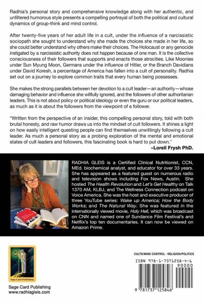Winner of the 2021 PenCraft Book Award, 1st Place, Non Fiction - Autobiography Radhia's personal story and comprehensive knowledge along with her authentic, and unfiltered humorous style presents a compelling portrayal of both the political and cultural dynamics of group-think and mind control. After twenty-five years of her adult life in a cult, under the influence of a narcissistic sociopath she sought to understand why she made the choices she made in her life, so she could better understand why others make their choices. The Holocaust or any genocide instigated by a narcissistic authority does not happen because of one man. It is the collective consciousness of their followers that supports and enacts those atrocities. Like Moonies under Sun Myung Moon, Germans under the influence of Hitler, or the Branch Davidians under David Koresh, a percentage of America has fallen into a cult of personality. Radhia set out on a journey to explore common traits that every human being possesses. She makes the strong parallels between her devotion to a cult leader-an authority-whose damaging behavior and influence she willfully ignored, and the followers of other authoritarian leaders. This is not about policy or political ideology or even the guru or our political leaders, as much as it is about the followers from the viewpoint of a follower. "Written from the perspective of an insider, this compelling personal story, told with both brutal honesty, and raw humor draws us into the mindset of cult followers. It shines a light on how easily intelligent questing people can find themselves unwittingly following a cult leader. As much a personal story as a probing exploration of the mental and emotional states of cult leaders and followers, this fascinating book is hard to put down." - Lorell Frysh PhD.