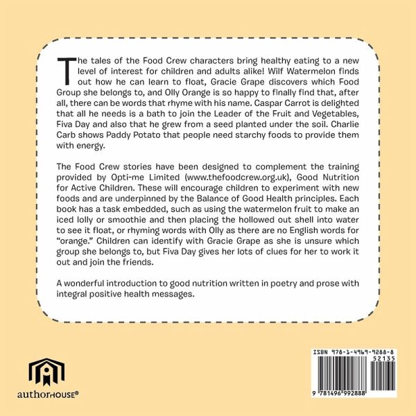 The tales of the Food Crew characters bring healthy eating to a new level of interest for children and adults alike! Wilf Watermelon finds out how he can learn to float, Gracie Grape discovers which Food Group she belongs to, and Olly Orange is so happy to finally find that, after all, there can be words that rhyme with his name. Caspar Carrot is delighted that all he needs is a bath to join the Leader of the Fruit and Vegetables, Fiva Day and also that he grew from a seed planted under the soil. Charlie Carb shows Paddy Potato that people need starchy foods to provide them with energy. The Food Crew stories have been designed to complement the training provided by Opti-me Limited (www.thefoodcrew.org.uk), Good Nutrition for Active Children. These will encourage children to experiment with new foods and are underpinned by the Balance of Good Health principles. Each book has a task embedded, such as using the watermelon fruit to make an iced lolly or smoothie and then placing the hollowed out shell into water to see it float, or rhyming words with Olly as there are no English words for "orange." Children can identify with Gracie Grape as she is unsure which group she belongs to, but Fiva Day gives her lots of clues for her to work it out and join the friends. A wonderful introduction to good nutrition written in poetry and prose with integral positive health messages.