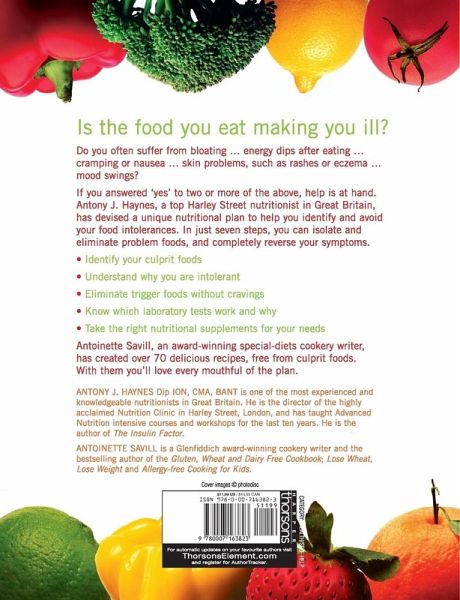 The definitive guide to targeting and reversing food intolerance from the UK's leading nutritionist, Antony Haynes, and Glenfiddich award-winning cookery writer, Antoinette Savill. A pain-free plan that will help people with food allergies, chronic fatigue, candida and much more. Includes over 70 delicious recipes. An indispensable book for anyone who suffers from food intolerance Renowned Harley Street nutritionist, Antony Haynes presents his 5-part plan to tackle food intolerance, which readers can put into action with the help of recipes from Antoinette Savill, (author of Lose Wheat, Lose Weight and The Gluten, Wheat and Dairy Free Cookbook.) This plan (which is regularly prescribed at Antony’s popular Harley Street clinic) gives an introduction to the diet and includes a selection of over 70 recipes which are typically free from common allergens, as well as sugar and yeast. The recipes appeal to everyone from the most sensitive to those on the road to recovery. Includes information and advice on the causes and treatment of intolerance, leaky gut and candida, friendly flora, how to strengthen the gut lining, and other key issues. Recipes include: Chilled courgette and mint soup • Rigatoni, olives and roast squash • Lasagne with salmon and goats' cheese sauce • Seared squid with pesto dressing • Chicken, fennel and pine nut risotto • Apricot and almond tart • Cinnamon carrot bread