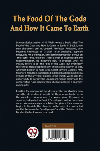 Science fiction author H. G. Wells wrote a book titled The Food of the Gods and How It Came to Earth. In Book I, two new characters are introduced: Professor Redwood, who becomes interested in ""Growth"" after analysing response times, and Mr. Bensington, a research chemist with a focus on ""the More Toxic Alkaloids."" After a year of investigation and experimentation, he discovers how to produce what he initially refers to as ""the Food of the Gods"" but eventually refers to as Herakleophorbia IV. The material is given to kids, who then balloon to huge sizes. Albert Edward Caddles, Mrs. Skinner's grandson, is described in Book II as becoming into a symbol of ""the arrival of Bigness in the world."" Wells uses the opportunity to parody the Church of England clergy and the conservative rural nobility while illustrating life in a poor tiny community. Caddles, the protagonist, decides to see the world rather than spend his life working in a chalk pit. The relationship between the nameless princess and the young giant Redwood is sensitively depicted in Book III's epilogue. Just as Caterham undertakes a campaign to subdue the giants, their romance begins to flourish. The planet is on the edge of a protracted conflict between the ""small people"" and the Children of the Food as the book comes to an end.
