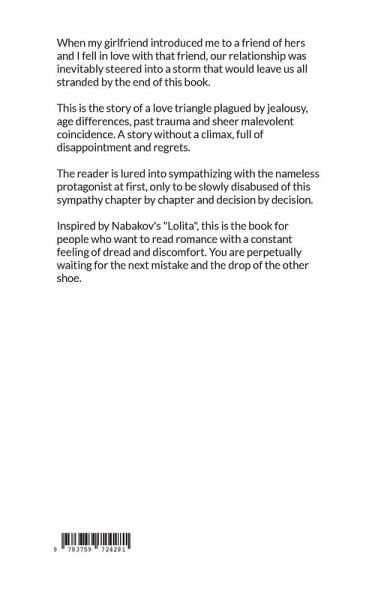 When my girlfriend introduced me to a friend of hers and I fell in love with that friend, our relationship was inevitably steered into a storm that would leave us all stranded by the end of this book. This is the story of a love triangle plagued by jealousy, age differences, past trauma and sheer malevolent coincidence. A story without a climax, full of disappointment and regrets. The reader is lured into sympathizing with the nameless protagonist at first, only to be slowly disabused of this sympathy chapter by chapter and decision by decision. Inspired by Nabakov's "Lolita", this is the book for people who want to read romance with a constant feeling of dread and discomfort. You are perpetually waiting for the next mistake and the drop of the other shoe.