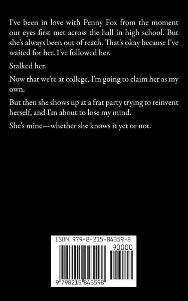 I've been in love with Penny Fox from the moment our eyes first met across the hall in high school. But she's always been out of reach. That's okay because I've waited for her. I've followed her. Stalked her. Now that we're at college, I'm going to claim her as my own. But then she shows up at a frat party trying to reinvent herself, and I'm about to lose my mind. She's mine-whether she knows it yet or not.