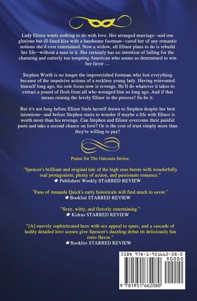 Lady Elinor wants nothing to do with love. Her arranged marriage-and one glorious but ill-fated kiss with a handsome footman-cured her of any romantic notions she'd ever entertained. Now a widow, all Elinor plans to do is rebuild her life-without a man in it. She certainly has no intention of falling for the charming and entirely too tempting American who seems so determined to win her favor … Stephen Worth is no longer the impoverished footman who lost everything because of the impulsive actions of a reckless young lady. Having reinvented himself long ago, his sole focus now is revenge. He'll do whatever it takes to exact a pound of flesh from all who wronged him so long ago. And if that means ruining the lovely Elinor in the process? So be it. But it's not long before Elinor finds herself drawn to Stephen despite her best intentions-and before Stephen starts to wonder if maybe a life with Elinor is worth more than his revenge. Can Stephen and Elinor overcome their painful pasts and take a second chance on love? Or is the cost of trust simply more than they're willing to pay? Praise for The Outcasts: "Spencer's brilliant and original tale of the high seas bursts with wonderfully real protagonists, plenty of action, and passionate romance." ¿Publishers Weekly STARRED REVIEW "Fans of Amanda Quick's early historicals will find much to savor." ¿Booklist STARRED REVIEW "Sexy, witty, and fiercely entertaining." ¿Kirkus STARRED REVIEW "[A] suavely sophisticated hero with sex appeal to spare, and a cascade of lushly detailed love scenes give Spencer's dazzling debut its deliciously fun retro flavor." ¿Booklist STARRED REVIEW Praise for A FIGURE OF LOVE, Book 2 in THE ACADEMY OF LOVE series: "A consistently entertaining read. Serena's past provides an exciting twist that will satisfy readers looking for something a little different in the historical romance genre." Kirkus Reviews "An offbeat story that offers unexpected twists on a familiar setup." Kirkus Reviews