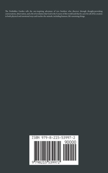 The Forbidden Garden tells the awe-inspiring adventure of two brothers who discover through thought-provoking conversations, observation, and a bit of revelation that God is the Creator of this world and that he cares for all of his creation in both physical and emotional ways and teaches the animals, including humans, life-sustaining things.