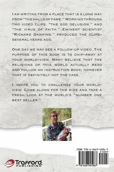 I am writing from a place that is a long way from the halls of fame. Working through two video clips, "the god delusion" and "the virus of faith." Eminent scientist Richard Dawkins produced the clips several years ago. There has been some reviews done on these videos in the past. Each time a comment has been made--it is from either side of the 'fence.' What makes this book so different; is that I am neither a religious-fundamentalist nor a scientist. One day, we may see a follow-up video. The purpose of this book is to chip away at your worldview. Many believe that the religions of this world actually read and follow an instruction book; however, that is definitely not the case. I invite you to challenge your worldview. Come along for the ride and take a fresh look at the world's "number one bestseller."
