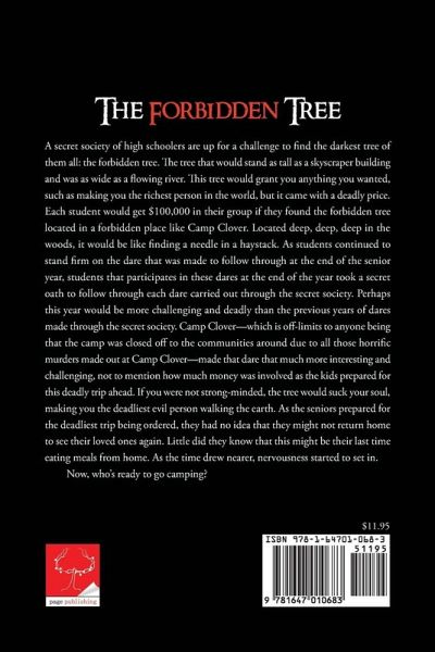 A secret society of high schoolers are up for a challenge to find the darkest tree of them all: the forbidden tree. The tree that would stand as tall as a skyscraper building and was as wide as a flowing river. This tree would grant you anything you wanted, such as making you the richest person in the world, but it came with a deadly price. Each student would get $100,000 in their group if they found the forbidden tree located in a forbidden place like Camp Clover. Located deep, deep, deep in the woods, it would be like finding a needle in a haystack. As students continued to stand firm on the dare that was made to follow through at the end of the senior year, students that participates in these dares at the end of the year took a secret oath to follow through each dare carried out through the secret society. Perhaps this year would be more challenging and deadly than the previous years of dares made through the secret society. Camp Clover-which is off-limits to anyone being that the camp was closed off to the communities around due to all those horrific murders made out at Camp Clover-made that dare that much more interesting and challenging, not to mention how much money was involved as the kids prepared for this deadly trip ahead. If you were not strong-minded, the tree would suck your soul, making you the deadliest evil person walking the earth. As the seniors prepared for the deadliest trip being ordered, they had no idea that they might not return home to see their loved ones again. Little did they know that this might be their last time eating meals from home. As the time drew nearer, nervousness started to set in. Now, who's ready to go camping?