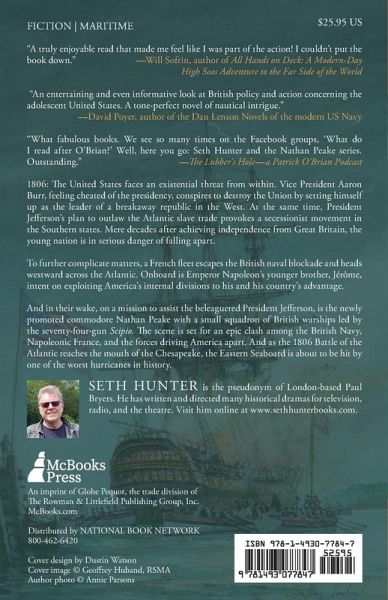 The ninth volume in the thrilling adventure series featuring Nathan Peake, British naval officer and spy, finds a young America divided against itself . . . 1806: The United States faces an existential threat from within. Vice President Aaron Burr, feeling cheated of the presidency, conspires to destroy the Union – and if he can’t become president legally, to set himself up as the leader of a breakaway republic in the West. At the same time, President Jefferson’s plan to outlaw the Atlantic slave trade provokes a secessionist movement in the Southern states. Mere decades after achieving independence from Great Britain, the young nation is in serious danger of falling apart. To further complicate matters, a French fleet escapes the British naval blockade and heads westward across the Atlantic. Onboard is Emperor Napoleon’s younger brother, Jerome, intent on exploiting America’s internal divisions to his and his country’s advantage. And in their wake, on a mission to assist the beleaguered President Jefferson, is the newly promoted commodore Nathan Peake with a small squadron of British warships led by the seventy-four-gun Scipio. Nathan has his own problems to contend with, however, and at times they appear overwhelming. They include his pregnant lover who is under suspicion of being a French agent, his secretive and complicated association with the Bonaparte family, his own dissident officers, the pro-slavery faction in the British Navy, and an American double agent intent on exploiting the national crisis for his own personal gain. The scene is set for an epic clash among the British Navy, Napoleonic France, and the forces driving America apart. And as the 1806 Battle of the Atlantic reaches the mouth of the Chesapeake, the Eastern Seaboard is about to be hit by one of the worst hurricanes in history.