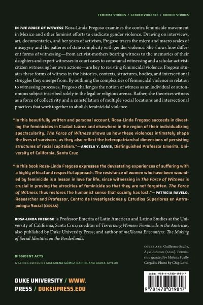 In The Force of Witness Rosa-Linda Fregoso examines the contra feminicide movement in Mexico and other feminist efforts to eradicate gender violence. Drawing on interviews, art, documentaries, and her years of activism, Fregoso traces the micro and macro scales of misogyny and the patterns of state complicity with gender violence. She shows how different forms of witnessing-from activist-mothers' bearing witness to the memories of their daughters and expert witnesses in court cases to communal witnessing and a scholar-activist-citizen witnessing her own actions-are key to resisting feminicidal violence. Fregoso situates these forms of witness in the histories, contexts, structures, bodies, and intersectional struggles they emerge from. By outlining the complexities of feminicidal violence in relation to witnessing processes, Fregoso challenges the notion of witness as an individual or autonomous subject inscribed solely in the legal or religious arenas. Rather, she theorizes witness as a force of collectivity and a constellation of multiple social locations and intersectional practices that work together to abolish feminicidal violence.