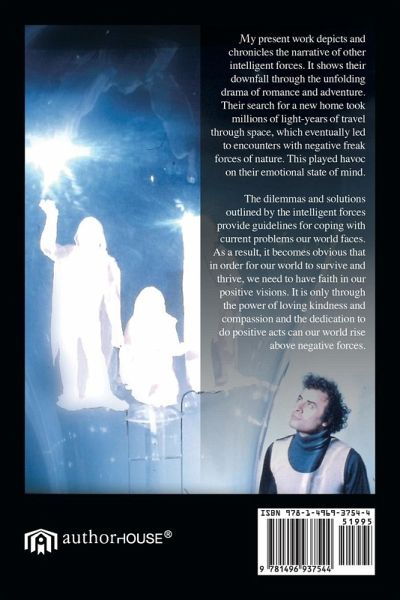My present work depicts and chronicles the narrative of other intelligent forces. It shows their downfall through the unfolding drama of romance and adventure. Their search for a new home took millions of light-years of travel through space, which eventually led to encounters with negative freak forces of nature. This played havoc on their emotional state of mind. The dilemmas and solutions outlined by the intelligent forces provide guidelines for coping with current problems our world faces. As a result, it becomes obvious that in order for our world to survive and thrive, we need to have faith in our positive visions. It is only through the power of loving kindness and compassion and the dedication to do positive acts can our world rise above negative forces.