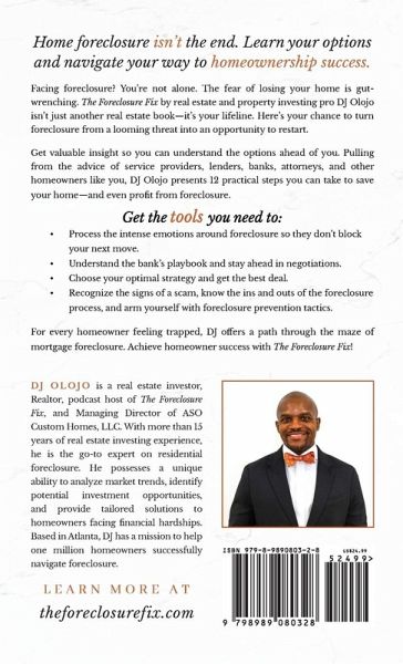 Home foreclosure isn't the end. Learn your options and navigate your way to homeownership success. Facing foreclosure? Feel like you're drowning in mortgage payments and looming deadlines? You're not alone. The fear of losing your home, probably your most valuable property, is gut-wrenching. Maybe you've tried to buy time by refinancing, talked to real estate experts, or negotiated new loan terms with your bank. Yet, that foreclosure notice remains, hanging over your head. The Foreclosure Fix! by real estate and property investing pro DJ Olojo isn't just another real estate book-it's your lifeline. Here's your chance to turn foreclosure from a looming threat into an opportunity to restart. With 15 years of experience helping homeowners with distressed mortgage debt, DJ has a deep understanding of the complexities surrounding home foreclosure. The Foreclosure Fix! brings that valuable insight into your hands so you can understand the options ahead of you. Pulling from advice from service providers, lenders, banks, attorneys, and other homeowners like you, DJ presents 12 practical steps you can take to save your home-and even profit from foreclosure. Get the tools you need to:Feel It, Then Fix It: Foreclosure can be a heavy emotional burden. Learn to process those feelings so they don't block your next move. Talk to Your Bank: Surprise-they might not want your home. Understand their playbook, and you'll be a step ahead in negotiations. Choose Your Strategy: Should you hold onto your property or sell? Dive into the strategies that can get you the best deal, whether you're dealing with an investor or a family looking for their dream home. Stay Sharp & Move Fast: With the clock ticking, knowledge is power. Recognize the signs of a scam, know the ins and outs of the foreclosure process, and arm yourself with foreclosure prevention tactics. For every homeowner feeling trapped, DJ offers a path through the maze of mortgage foreclosure. Get the clarity to master the foreclosure challenge with expert advice from someone who has helped thousands of homeowners find their way from trapped to in-control and confident in their financial decisions. Achieve homeowner success with The Foreclosure Fix!