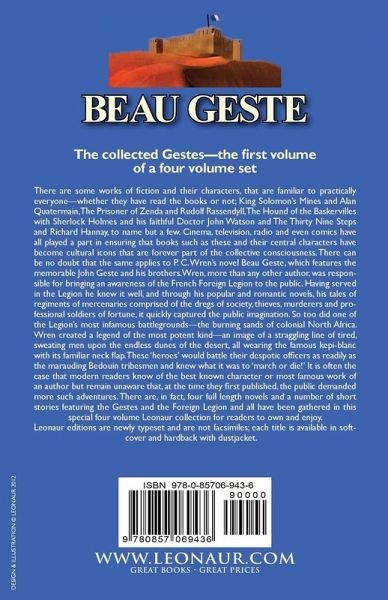 The collected Gestes-the first volume of a four volume set There are some works of fiction and their characters, that are familiar to practically everyone-whether they have read the books or not; King Solomon's Mines and Alan Quatermain, The Prisoner of Zenda and Rudolf Rassendyll, The Hound of the Baskervilles with Sherlock Holmes and his faithful Doctor John Watson and The Thirty Nine Steps and Richard Hannay, to name but a few. Cinema, television, radio and even comics have all played a part in ensuring that books such as these and their central characters have become cultural icons that are forever part of the collective consciousness. There can be no doubt that the same applies to P. C. Wren's novel Beau Geste, which features the memorable John Geste and his brothers. Wren, more than any other author, was responsible for bringing an awareness of the French Foreign Legion to the public. Having served in the Legion he knew it well, and through his popular and romantic novels, his tales of regiments of mercenaries comprised of the dregs of society, thieves, murderers and professional soldiers of fortune, it quickly captured the public imagination. So too did one of the Legion's most infamous battlegrounds-the burning sands of colonial North Africa. Wren created a legend of the most potent kind-an image of a straggling line of tired, sweating men upon the endless dunes of the desert, all wearing the famous kepi-blanc with its familiar neck flap. These 'heroes' would battle their despotic officers as readily as the marauding Bedouin tribesmen and knew what it was to 'march or die!' It is often the case that modern readers know of the best known character or most famous work of an author but remain unaware that, at the time they first published, the public demanded more such adventures. There are, in fact, four full length novels and a number of short stories featuring the Gestes and the Foreign Legion and all have been gathered in this special four volume Leonaur collection for readers to own and enjoy. Leonaur editions are newly typeset and are not facsimiles; each title is available in softcover and hardback with dustjacket.