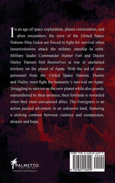 In an age of space exploration, planet colonization, and alien encounters, the crew of the United Space Nations Ship Galen are forced to fight for survival when insurrectionists attack the military starship in orbit. Military leader Commander Hunter Fort and Doctor Hailey Hansen find themselves at war in uncharted territory on the planet of Apate. With the aid of other personnel from the United Space Nations, Hunter and Hailey must fight for humanity's survival on Apate. Struggling to survive on the new planet while also grossly outnumbered by their enemies, their fortitude is rewarded when they meet unexpected allies. The Foreigners is an action packed adventure in an unknown land, featuring a striking contrast between violence and compassion, despair and hope.