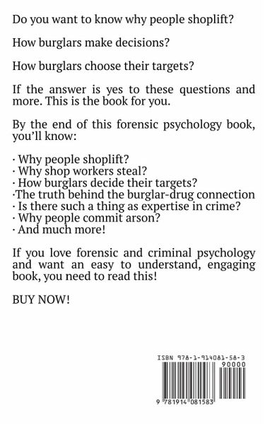 Whether you're a psychology student, a forensic psychologist or just a person interested in forensic psychology. You'll love this book! Do you want to know why people shoplift? How burglars make decisions? How burglars choose their targets? If the answer is yes to these questions and more. This is the book for you. By the end of this forensic psychology book, you'll know: · Why people shoplift? · Why shop workers steal? · How burglars decide their targets? · The truth behind the burglar-drug connection · Is there such a thing as expertise in crime? · Why people commit arson? · And much more! If you love forensic and criminal psychology and want an easy to understand, engaging book, you need to read this! BUY NOW! The Forensic Psychology of Theft, Burglary and Other property Crimes Content: Introduction Chapter 1: Theft and Shoplifting Chapter 2: Burglary: Types of Bulgars, The Burglary -Drug Connection And Decision-Making Processes Chapter 3: Expertise in Crime Chapter 4: Arson and Pyromania Conclusion