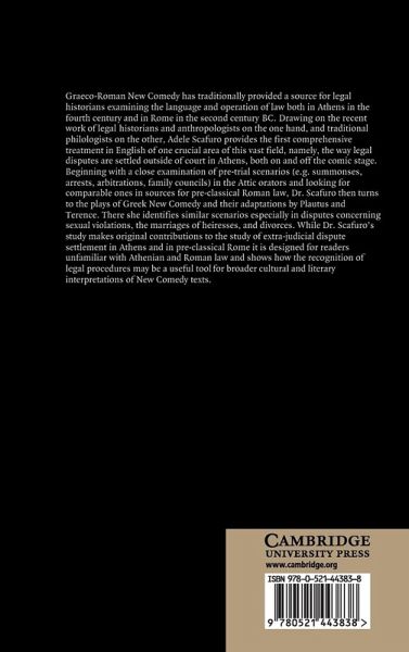 Graeco-Roman New Comedy has traditionally provided a source for legal historians examining the language and operation of law both in Athens in the fourth century and in Rome in the second century BC. Adele Scafuro here provides the first comprehensive treatment in English of one crucial area of this vast field, namely, the way legal disputes are settled out of court in Athens, both on and off the comic stage. Beginning with a close examination of pre-trial scenarios in the Attic orators and looking for comparable ones in pre-classical Roman law, Dr Scafuro then turns to the plays of Greek New Comedy and their adaptations by Plautus and Terence. There she identifies similar scenarios especially in disputes concerning sexual violations, the marriages of heiresses, and divorces. She shows how the recognition of legal procedures aids interpretation of New Comedy texts.