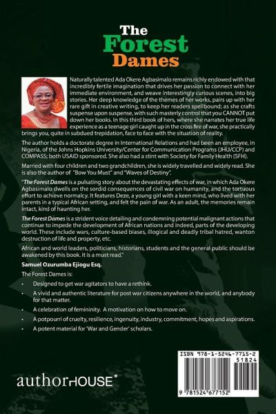 Naturally talented Ada Okere Agbasimalo remains richly endowed with that incredibly fertile imagination that drives her passion to connect with her immediate environment, and weave interestingly curious scenes, into big stories. Her deep knowledge of the themes of her works, pairs up with her rare gift in creative writing, to keep her readers spellbound; as she crafts suspense upon suspense, with such masterly control that you CANNOT put down her books. In this third book of hers, where she narrates her true life experience as a teenage girl caught up in the cross fire of war, she practically brings you, quite in subdued trepidation, face to face with the situation of reality. The author holds a doctorate degree in International Relations and had been an employee, in Nigeria, of the Johns Hopkins University/Center for Communication Programs (JHU/CCP) and COMPASS; both USAID sponsored. She also had a stint with Society for Family Health (SFH). Married with four children and two grandchildren, she is widely travelled and widely read. She is also the author of "Bow You Must" and "Waves of Destiny". "The Forest Dames is a pulsating story about the devastating effects of war, in which Ada Okere Agbasimalo dwells on the sordid consequences of civil war on humanity, and the tortuous effort to achieve normalcy. It features Deze, a young girl with a keen mind, who lived with her parents in a typical African setting, and felt the pain of war. As an adult, the memories remain intact, kind of haunting her. The Forest Dames is a strident voice detailing and condemning potential malignant actions that continue to impede the development of African nations and indeed, parts of the developing world. These include wars, culture-based biases, illogical and deadly tribal hatred, wanton destruction of life and property, etc. African and world leaders, politicians, historians, students and the general public should be awakened by this book. It is a must read." Samuel Ozurumba Ejiogu Esq. The Forest Dames is: • Designed to get war agitators to have a rethink. • A vivid and authentic literature for post war citizens anywhere in the world, and anybody for that matter. • A celebration of femininity. A motivation on how to move on. • A potpourri of cruelty, resilience, ingenuity, industry, commitment, hopes and aspirations. • A potent material for 'War and Gender' scholars. "The girls watched the women melt into the thick forest, through the same emergency pathway that had led them in. This time, there was no sound of water; there were no whispers, only footsteps on the path."