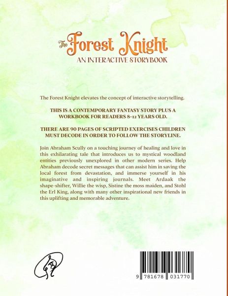 The Forest Knight elevates the concept of interactive storytelling. This is a contemporary fantasy story plus a workbook for readers ages 8-12 years old. There are 90 pages of scripted exercises children must decode in order to follow the storyline. Join Abraham Scully on a touching journey of healing and love in this exhilarating tale that introduces us to mystical woodland entities previously unexplored in other modern series. Help Abraham decode secret messages that can assist him in saving the local forest from devastation, and immerse yourself in his imaginative and inspiring journals. Meet Ardaak the shape-shifter, Willie the wisp, Sistine the moss maiden, and Stohl the Erl King, along with many other inspirational new friends in this uplifting and memorable adventure.