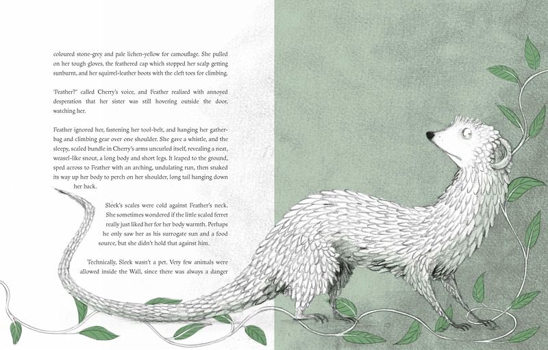 The hungry Forest is moving forward like an army, a green and constant threat to the humans living in and on an increasingly crumbling Wall. Feather, accompanied only by her scaled ferret, Sleek, must avoid the Forest's tentacles, and the many dangerous creatures it shelters, to return the community's precious spyglass to its rightful place. Along the way, she develops her resilience, and meets other people living on the Wall, whose stories and experiences open her mind, and those of her community, to new horizons.