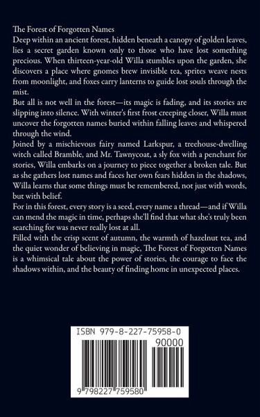 The Forest of Forgotten Names Deep within an ancient forest, hidden beneath a canopy of golden leaves, lies a secret garden known only to those who have lost something precious. When thirteen-year-old Willa stumbles upon the garden, she discovers a place where gnomes brew invisible tea, sprites weave nests from moonlight, and foxes carry lanterns to guide lost souls through the mist. But all is not well in the forest-its magic is fading, and its stories are slipping into silence. With winter's first frost creeping closer, Willa must uncover the forgotten names buried within falling leaves and whispered through the wind. Joined by a mischievous fairy named Larkspur, a treehouse-dwelling witch called Bramble, and Mr. Tawnycoat, a sly fox with a penchant for stories, Willa embarks on a journey to piece together a broken tale. But as she gathers lost names and faces her own fears hidden in the shadows, Willa learns that some things must be remembered, not just with words, but with belief. For in this forest, every story is a seed, every name a thread-and if Willa can mend the magic in time, perhaps she'll find that what she's truly been searching for was never really lost at all. Filled with the crisp scent of autumn, the warmth of hazelnut tea, and the quiet wonder of believing in magic, The Forest of Forgotten Names is a whimsical tale about the power of stories, the courage to face the shadows within, and the beauty of finding home in unexpected places.