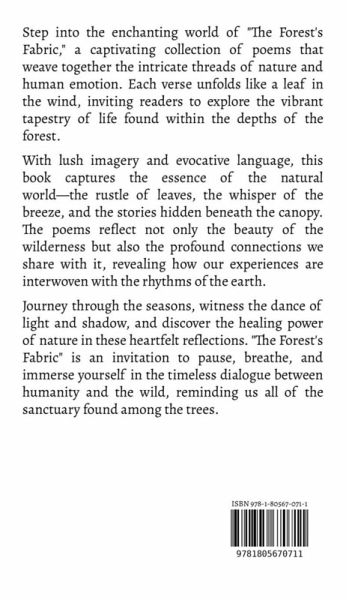 Step into the enchanting world of "The Forest's Fabric," a captivating collection of poems that weave together the intricate threads of nature and human emotion. Each verse unfolds like a leaf in the wind, inviting readers to explore the vibrant tapestry of life found within the depths of the forest. With lush imagery and evocative language, this book captures the essence of the natural world-the rustle of leaves, the whisper of the breeze, and the stories hidden beneath the canopy. The poems reflect not only the beauty of the wilderness but also the profound connections we share with it, revealing how our experiences are interwoven with the rhythms of the earth. Journey through the seasons, witness the dance of light and shadow, and discover the healing power of nature in these heartfelt reflections. "The Forest's Fabric" is an invitation to pause, breathe, and immerse yourself in the timeless dialogue between humanity and the wild, reminding us all of the sanctuary found among the trees.